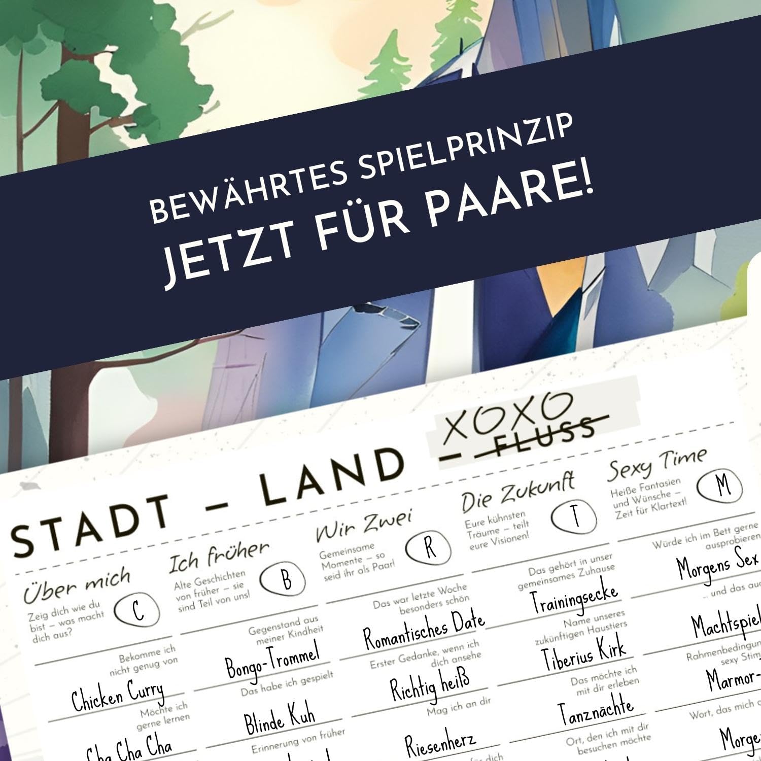 Nach dem bekannten Stadt-Land-Fluss Prinzip erfahrt ihr bei dieser neuen Version mehr über euch als Paar. Komplimente, Anekdoten, einfach eine gute Zeit. Mutige können mit dem Level „Sexy Time“ ihre Bettgeschichten auf ein neues Level heben.